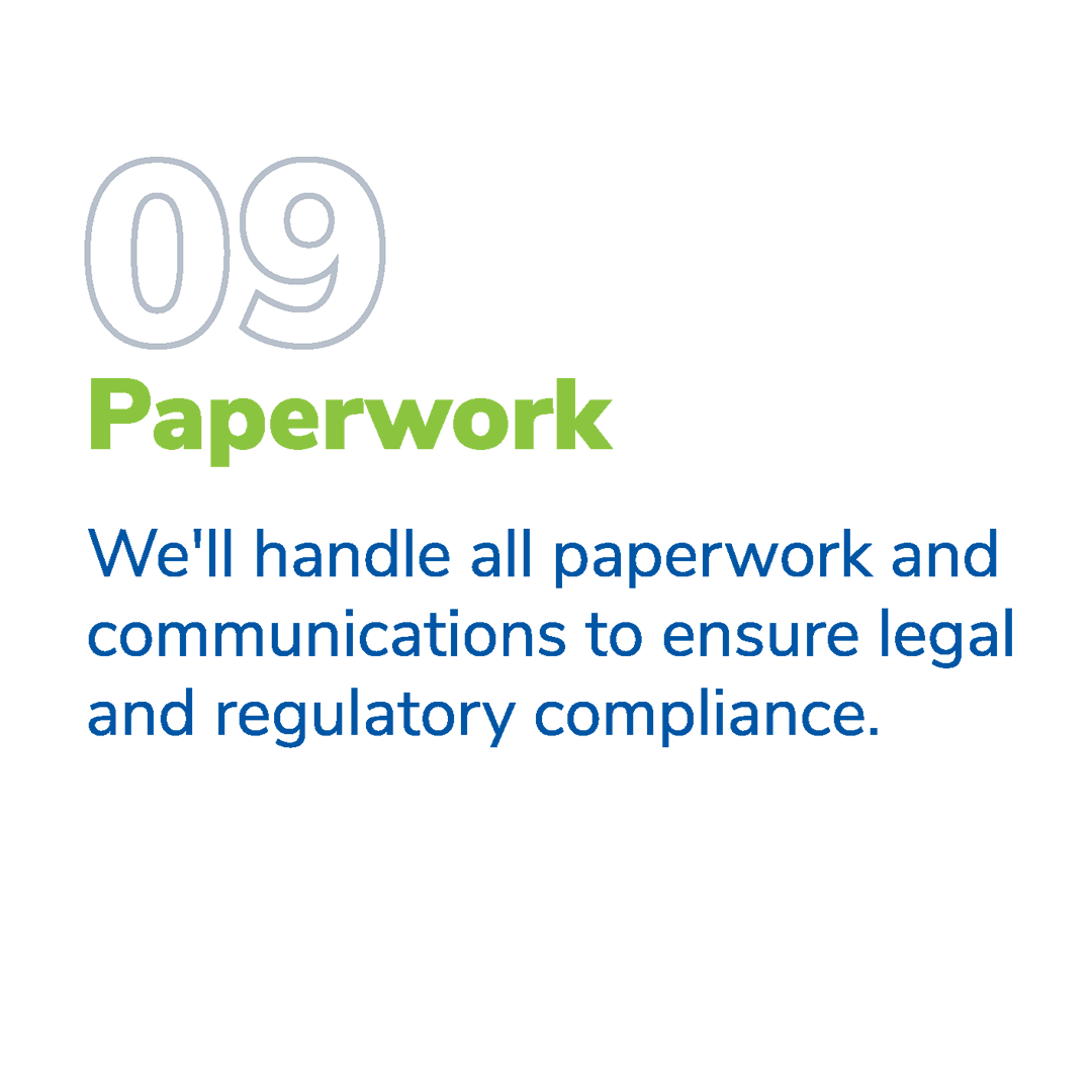 Recibirás un resumen de seguimiento de nuestra reunión, con información detallada sobre tu pedido preliminar. Una vez que hayas revisado los detalles y te sientas cómodo para seguir adelante, procesaremos tu contrato firmado y los materiales del pedido.